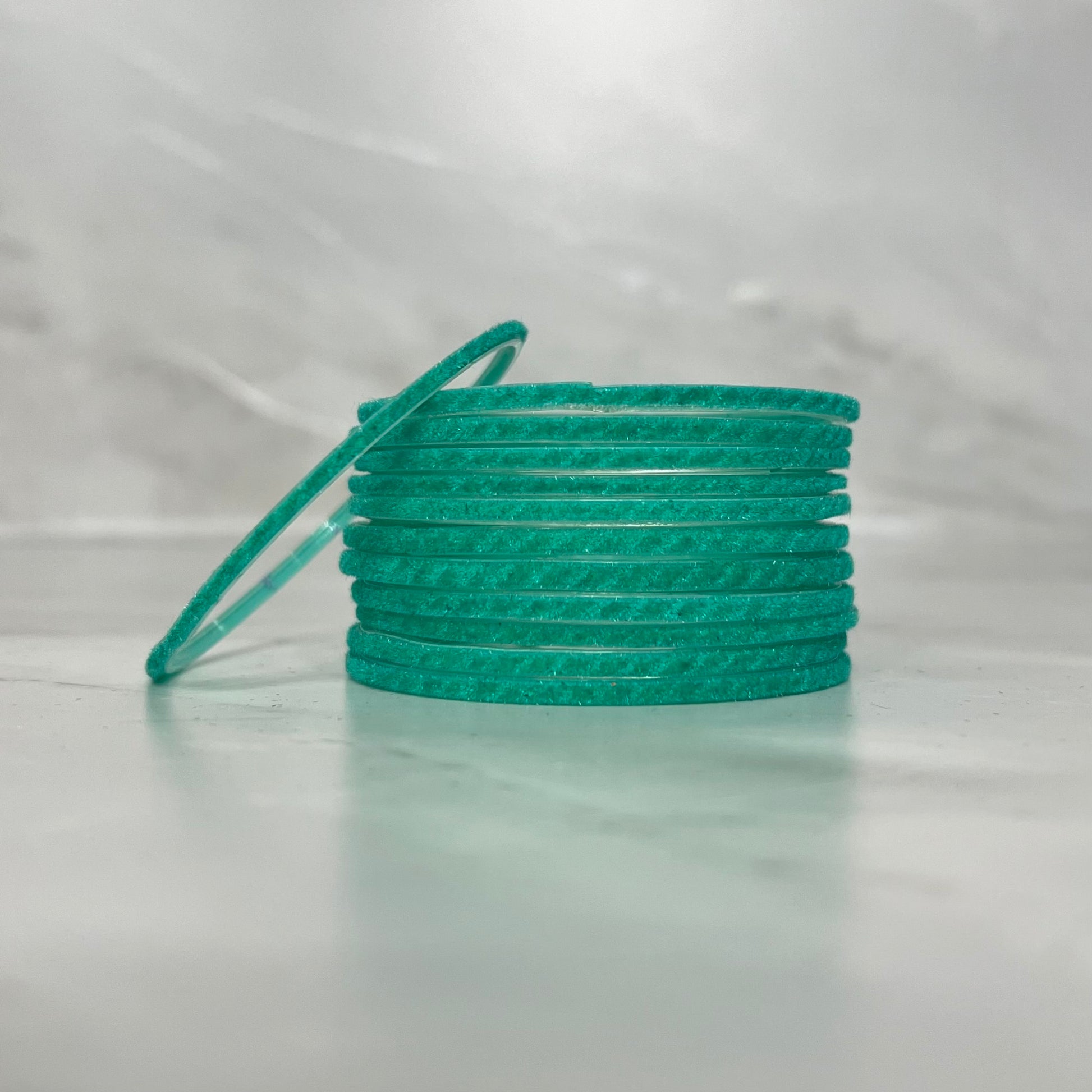 Set of 12 glass bangles with detailed velvet texture.