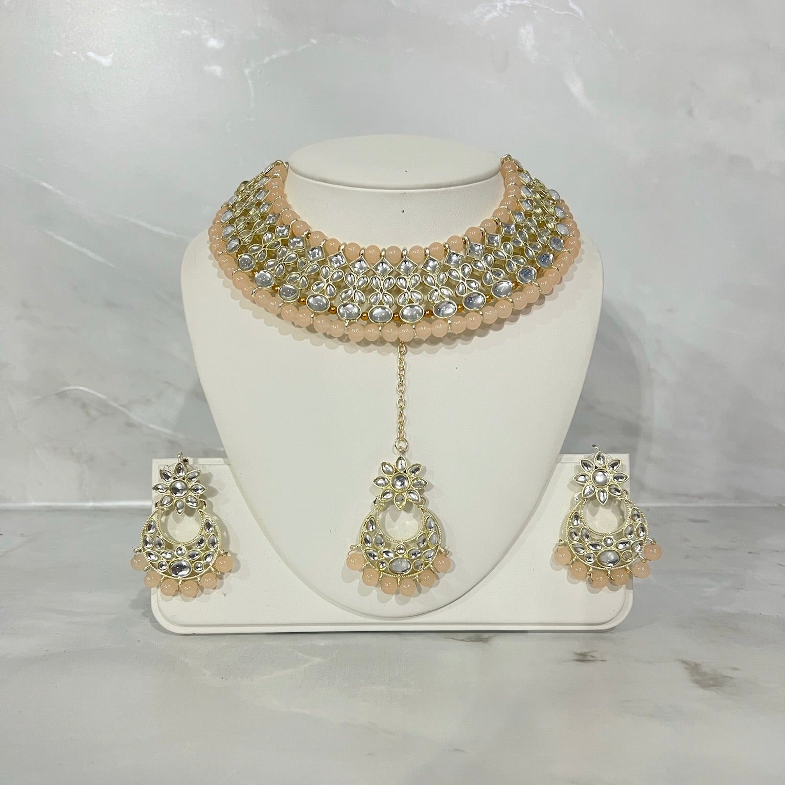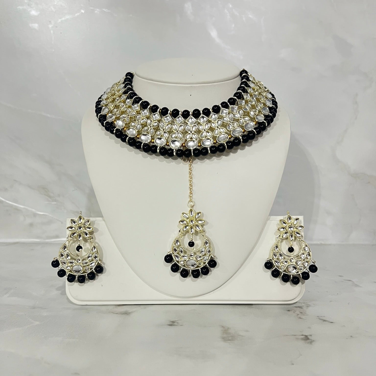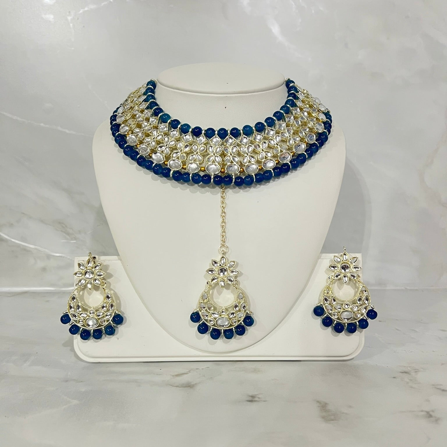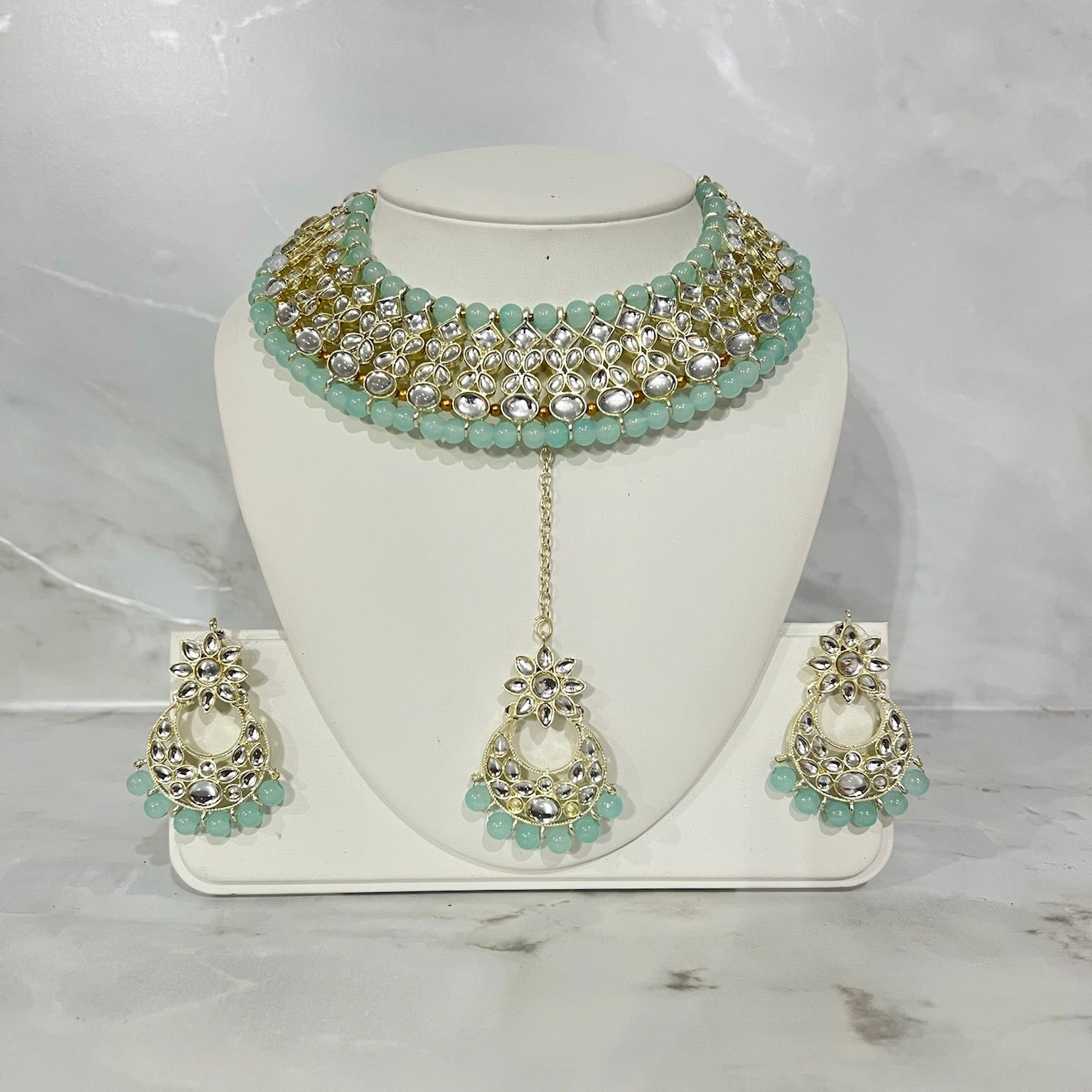 Light Gold Faux Kundan Beaded Necklace Set in Black, Dark Blue, Blue, Mint, Peach, Mauve, Purple