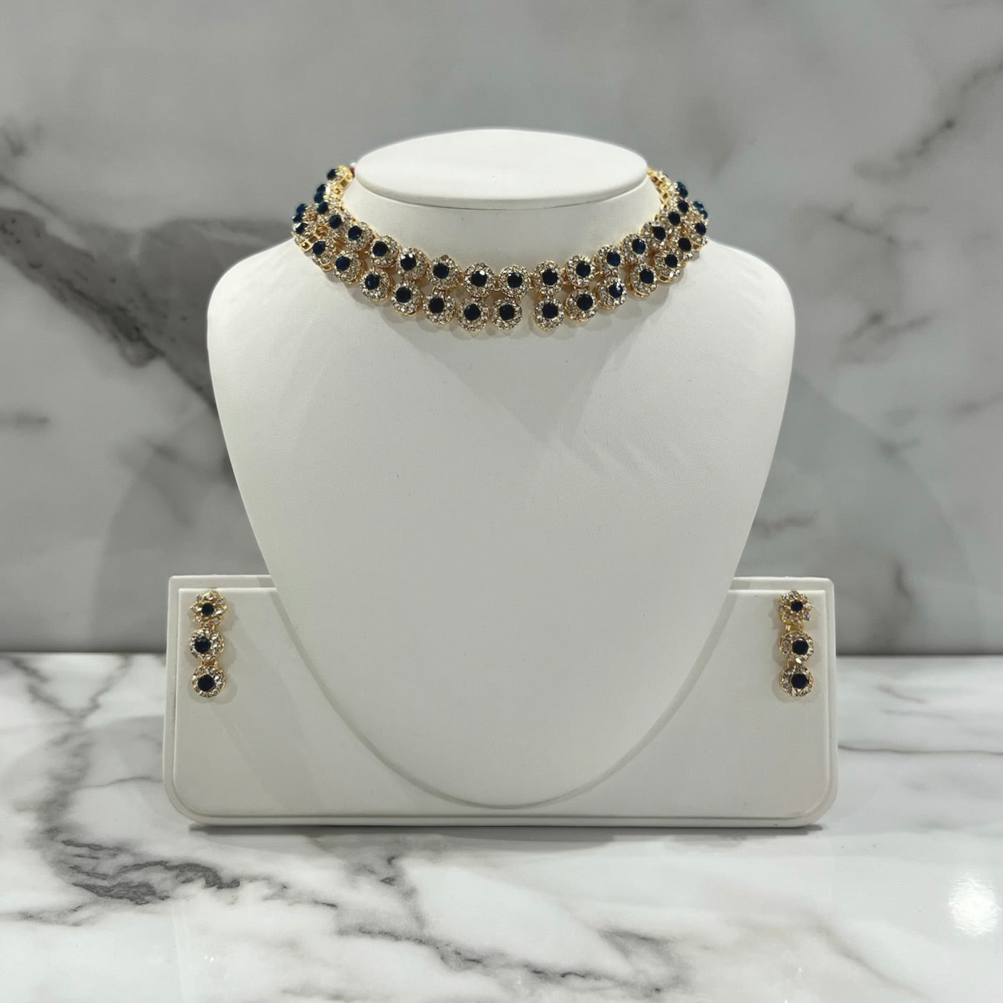 Crystal work on a gold base choker with blue detailing and drop earrings.