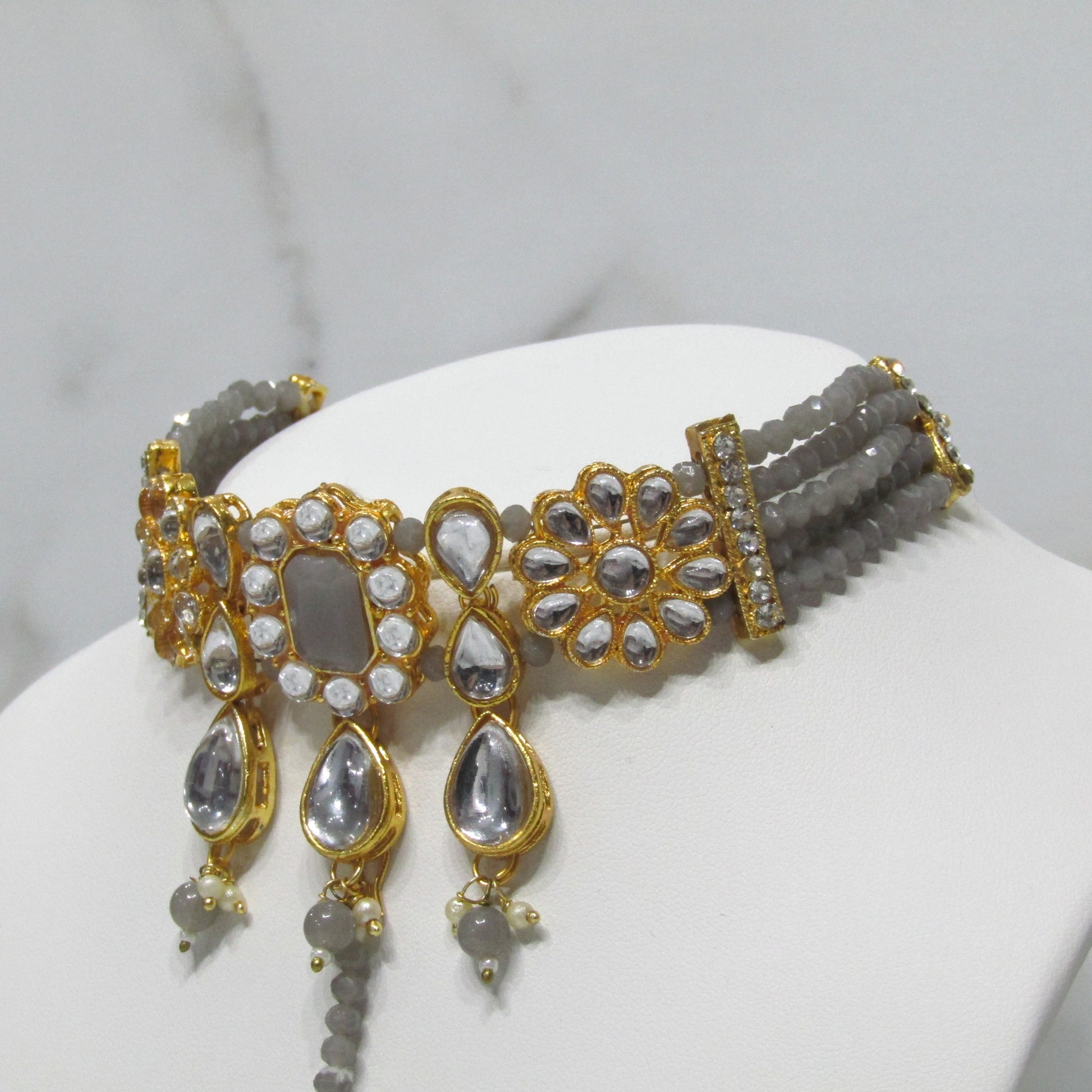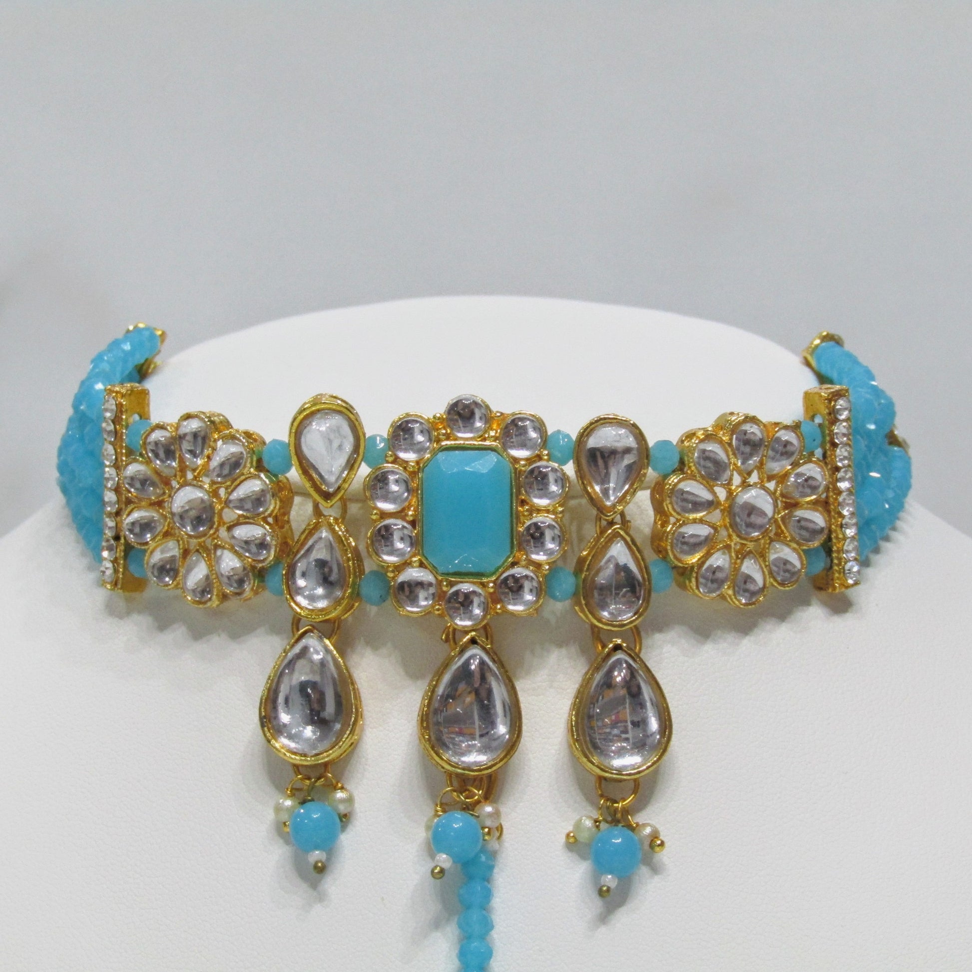 Gold Faux Kundan Choker Necklace Set with Beads in Royal Blue, Emerald Green, Light Blue, Pink, Peach, Rani Pink, Red and Grey.