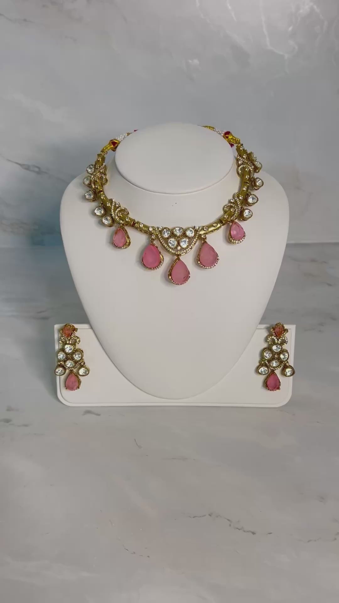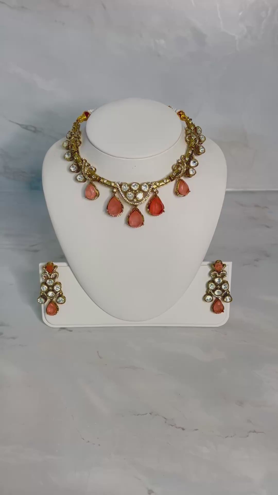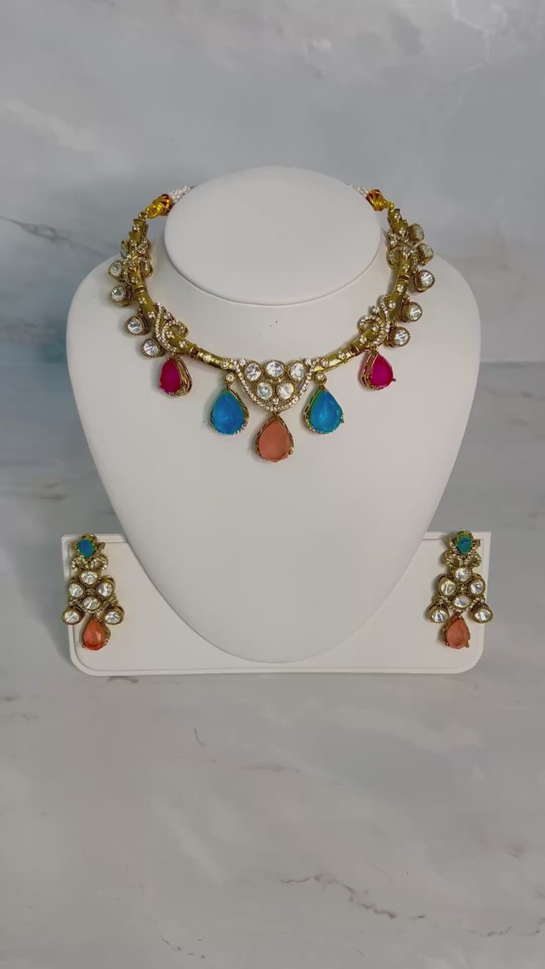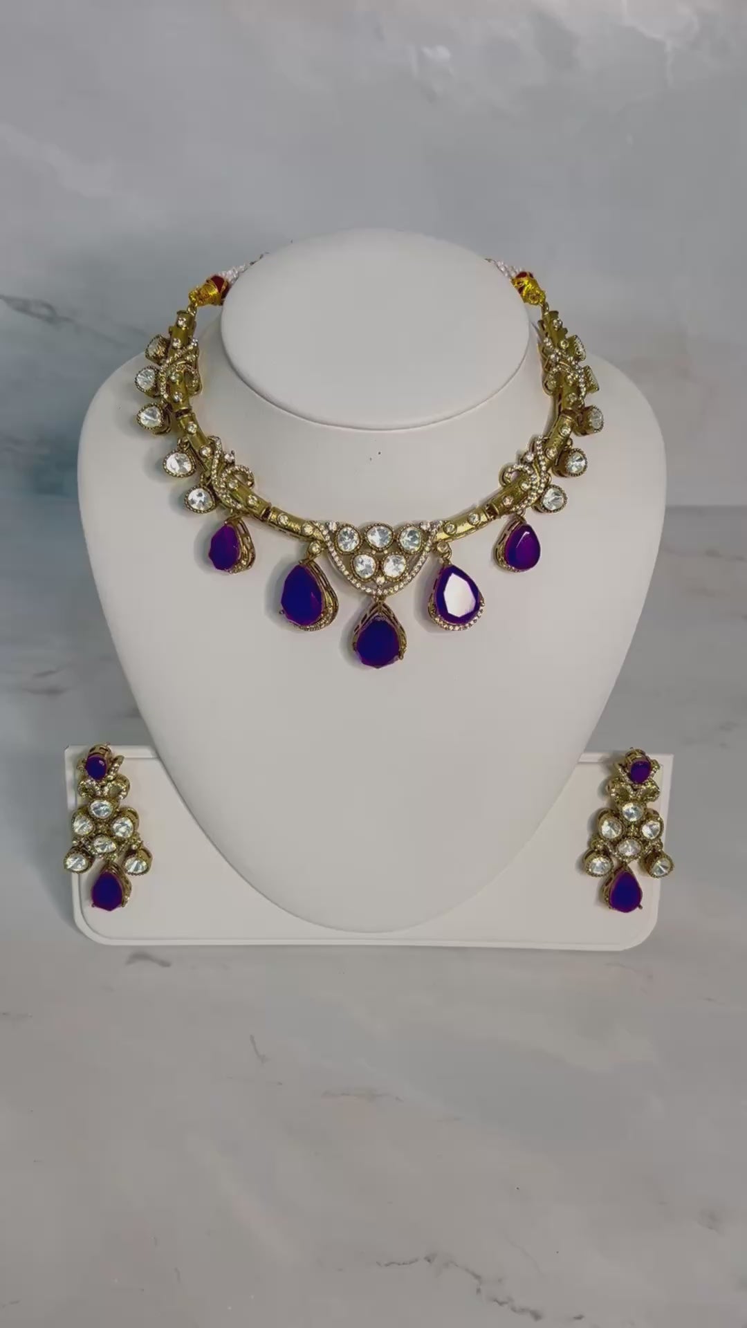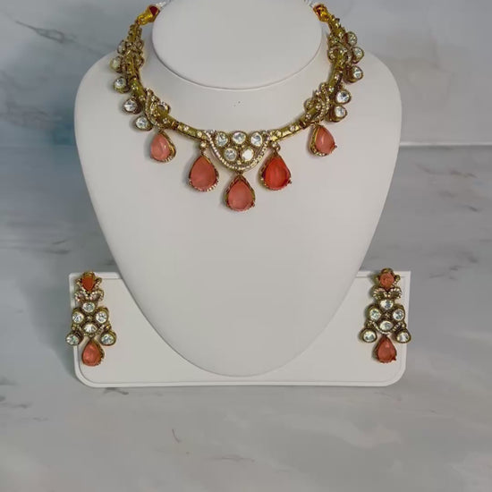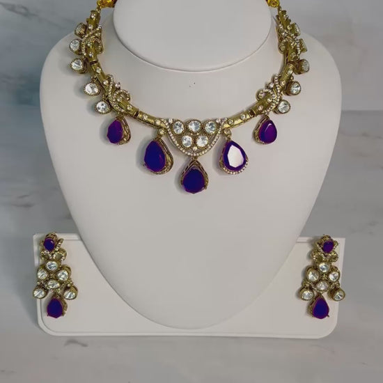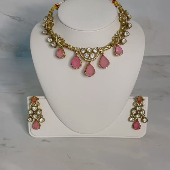 Moissanite and American Diamond work on an antique gold polish base with doublet stone details and drop earrings. Available in: Pink, Peach, Purple, and Multicolour