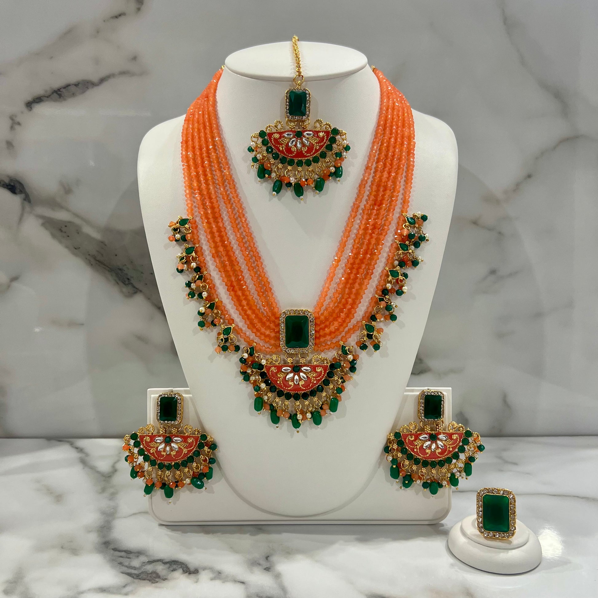 Orange and Green Mala, Tikka, Earring and Ring Set