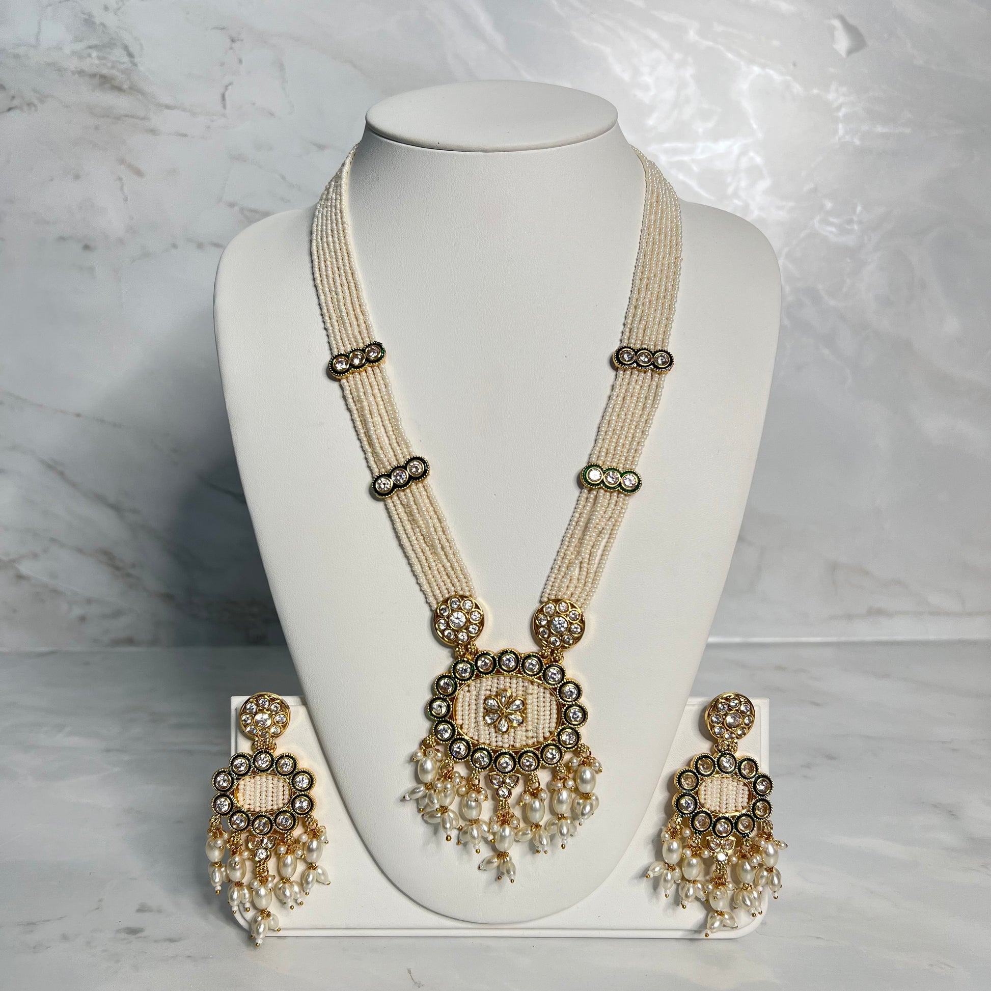 Polki and crystal work on a gold base with pearl and coloured beaded details and matching earrings. This set comes in: Mint Green, White, Rani and Green, and Baby Pink.